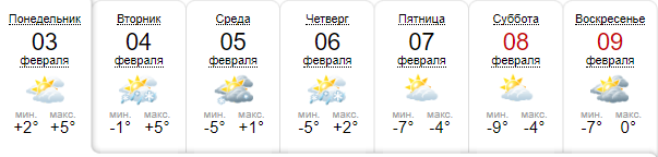 Сайт Gismeteо прогнозирует, что неделя начнется с весенней погоды. Дневная температура 3 февраля - около +2...+5 градусов и дожди сменятся снегом уже в среду-четверг. Самые холодные дни обещают в пятницу и субботу, когда днем будет -4...-5 градусов, а ночью -8....-9 градусов.