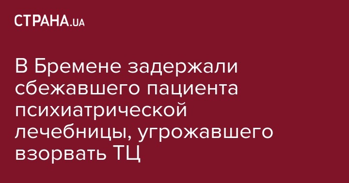 Сбежавший из психиатрической лечебницы пациент, который угрожал взрывом в торговом центре Бремена уже задержан правоохранителями, передает Reuters.