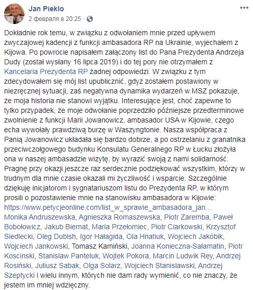 В то же время он отмечает, что его назначил правительство PiS и выдвинул Анджей Дуда. Пекло стал послом Польши в Украине в октябре 2016 года. Его срок полномочий был сокращен, и он покинул Киев ровно год назад.