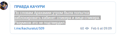 И судя по всему, сегодня в парламенте произошел серьезный инцидент. Была предпринята заблокировать рабочие кабинеты руководства Верховной Рады. Об этом в своем Telegram-канале сообщил народный депутат из фракции "Слуга народа" Александр Качура. При этом сослался на главу своей фракции Давида Арахамию, как на источник информации.