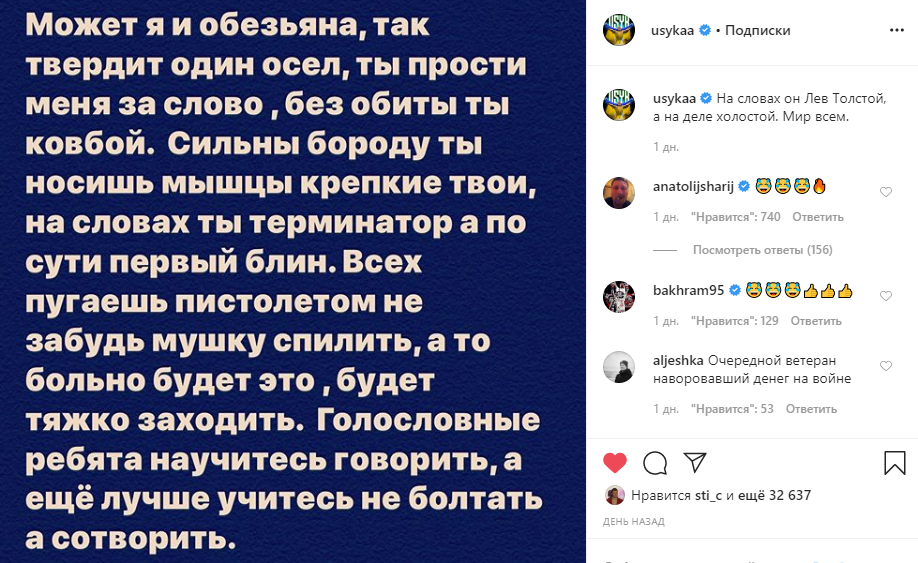 В комментариях пользователи всячески поддерживают украинского боксера и ругают Остальцева: "Очередной ветеран, наворовавший денег на войне", "Не стоит обращать внимание на петухов, они только кукарекают, а по сути ни о чем", "Можно было бы не отвечать, слишком много чести", "Круто, очень уважаю вас", "Забей, Саня. Слишком много внимания мамкиному застенчивому нацистику, им всем завидно, что они лижут жопу, ради денег, а вы с Васей нет", – пишут в отзывах юзеры.