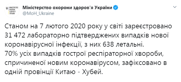 Так, по данным МОЗ, в мире 7 февраля зарегистрировано 31 472 лабораторно подтвержденных случая заражения китайским коронавирусом, из них 638 летальные.