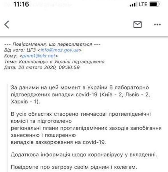 "По данным на этот момент в Украине 5 лабораторно подтвержденных случая covid-19 (Киев - 2, Львов-2, Харьков - 1). Во всех областях созданы временные противоэпидемические комиссии и подготовлены региональные планы противоэпидемических мер предотвращения занесению и распространению случаев заболевания covid-19. Дополнительная информация о коронавирусе во вложении. Сообщите об угрозе своим родным и коллегам", - говорилось в письме.