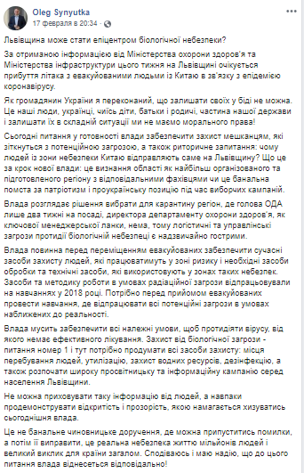 "По полученной информации от Министерства здравоохранения и Министерства инфраструктуры на этой неделе на Львовщине ожидается прибытие самолета с эвакуированными людьми из Китая в связи с эпидемией коронавируса" - написал Синютка.