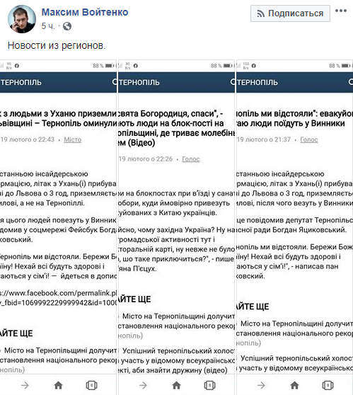 Местные СМИ пестрели заголовками: "Самолет с людьми из Уханя приземлится на Львовщине - Тернополь обошли", "Пресвятая Богородица спаси" - поют люди на блок-посте на Тернопольщине, где продолжается молебен под дождем", "Тернополь мы отстояли: эвакуированные из Китая люди поедут в Винники".