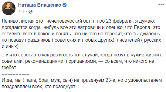 "Лениво листая этот нечеловеческий баттл про 23 февраля, я думаю: догадаются когда- нибудь все эти вятровичи и олешко, что Европа- это оставить всех в покое и понять, что никого не теребит, что ты думаешь по поводу праздников ( советских и любых других), писателей ( русских и иных)...