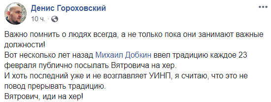 Вот несколько лет назад Михаил Добкин ввел традицию каждое 23 февраля публично посылать Вятровича на х...р.