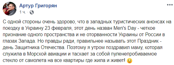 "С одной стороны очень здорово, что в западных туристических анонсах на поездку в Украину 23 февраля, этот день назван Men's Day - четкое признание одного пространства и не оторванности Украины от России в глазах Запада. Но правды ради, правильнее называть этот Праздник - день Защитника Отечества. Поэтому я утром поздравил маму, которая служила в Морской авиации и таскает за собой пуленепробиваемое стекло от самолета на все квартиры где жила и живет".