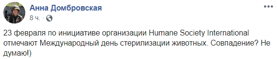 "23 февраля по инициативе организации Humane Society International отмечают Международный день стерилизации животных. Совпадение? Не думаю!"