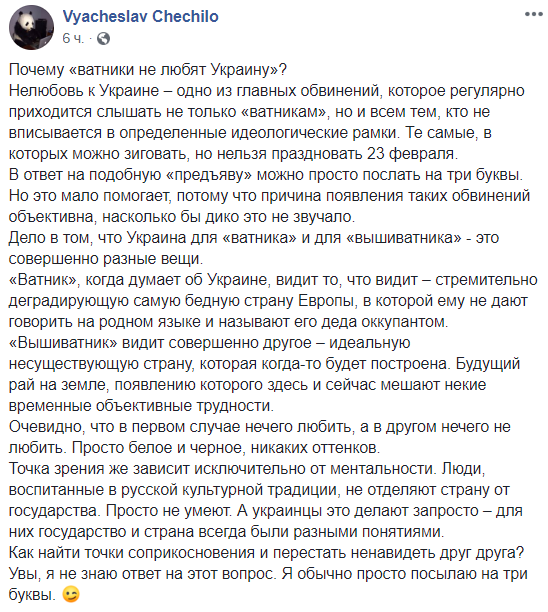 Дело в том, что Украина для "ватника" и для "вышиватника" - это совершенно разные вещи.