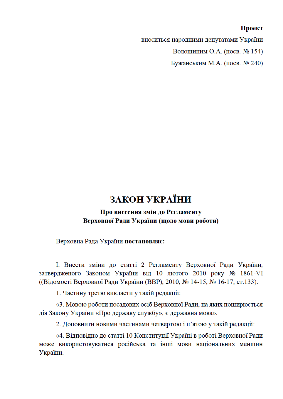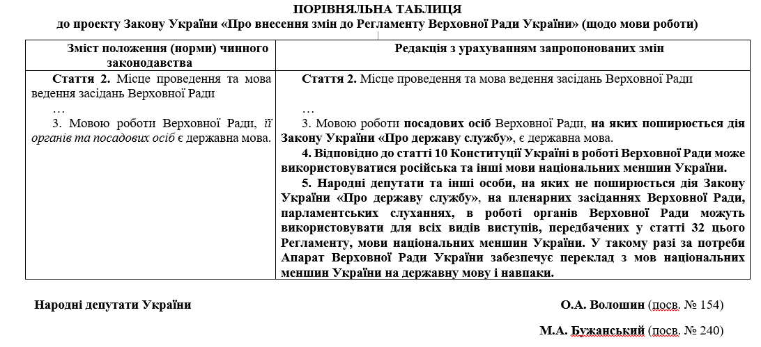 В пояснительной записке Бужанский и Волошин отмечают: поскольку статья 2 Регламента Рады устанавливает языком работы парламента государственный язык, в нем не реализованы конституционные гарантии и нормы о свободном развитии, использовании и защите русского и других языков национальных меньшинств Украины. Эти гарантии перечислены в статье 10 Основного закона страны.