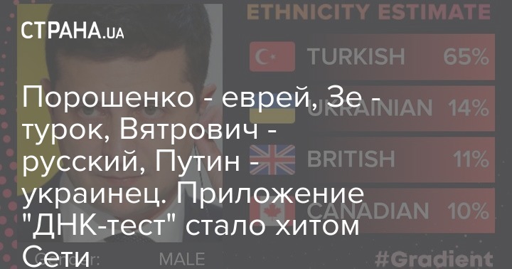 На фото президента Украины Владимира Зеленского, который родился в украинско-еврейской семье, приложение разглядело 65% турецкой крови, 14% - украинской, а также немного британской и канадской.