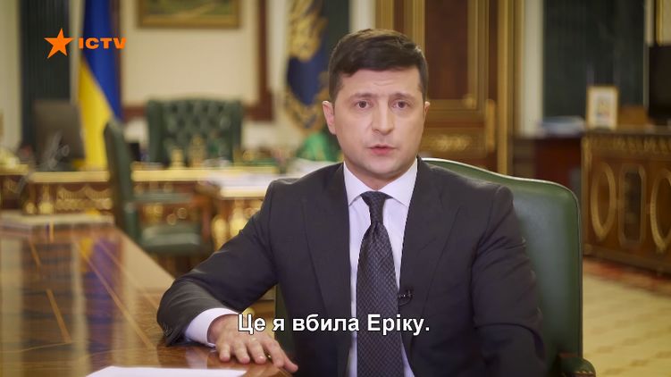 Вместо речи главы государства о возвращении украинцев, которые находятся за границей зрители канала увидели такие титры: "Это я убила Эрику. Она забрала у меня любимого человека. Простите меня, если сможете. Белла Осмоловская. Почему напечатано? Почему не от руки? Кристиан, принеси лестницу. Ворсинки от веревки направлены вверх. Таким образом, тело подтягивали уже после смерти".