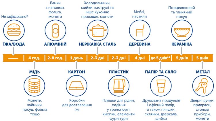 В Центре общественного здоровья Украины рассказали, что коронавирусы могут жить на поверхностях до 5 дней. Дольше всего вирус живет на металле, но заразность вируса значительно снижается уже через 3 часа.