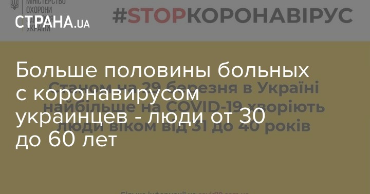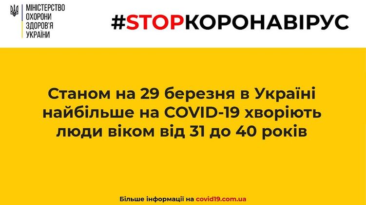 Министерство охраны здоровья Украины привело статистику больных коронавирусом по возрастным группам. По состоянию на 29 марта в Украине COVID-19 больше всего болеют люди в возрасте от 31 года до 40 лет.