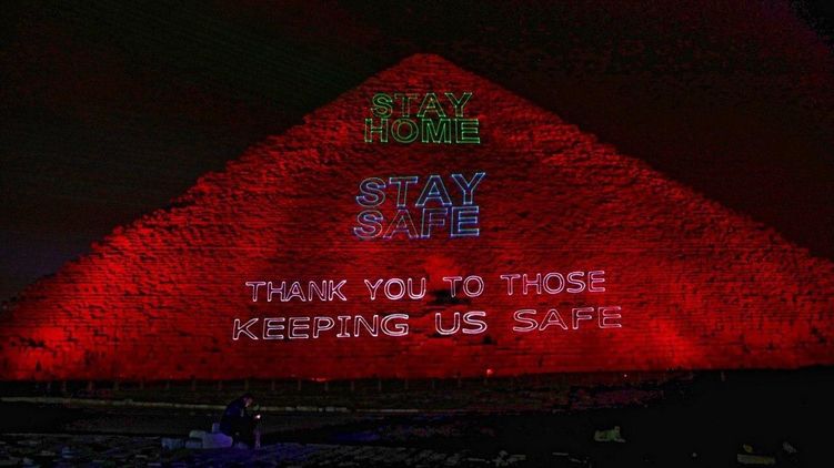 В долине Гизы пирамиду Хеопса расцветили призывами оставаться дома, чтобы и самим быть в безопасности и не создавать проблем врачам и окружающим.