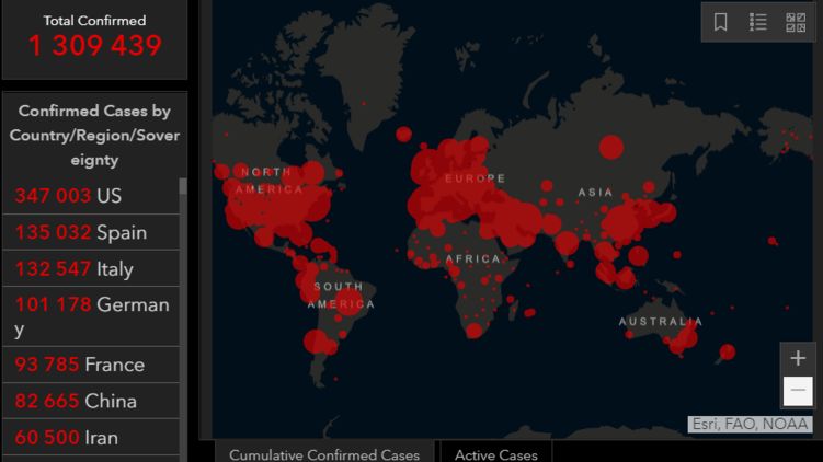 Во всем мире, по данным Университета, количество зараженных достигло 1,3 миллиона в 184 странах. 72,6 тысяч человек умерли, 273,5 тысяч выздоровели.