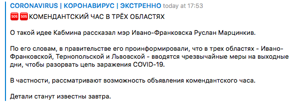 "По его словам, в правительстве его проинформировали, что в трех областях - Ивано-Франковской, Тернопольской и Львовской - вводятся чрезвычайные меры на выходные дни, чтобы разорвать цепь заражения COVID-19. В частности, рассматривают возможность объявления комендантского часа. Детали станут известны завтра".