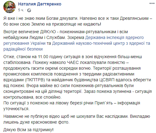"Прекратите наконец-то врать! Что вы якобы контролируете ситуацию. О каком "горении травяного настила, камыша и лесной подстилки отдельными очагами" вы твердите?! Сейчас ситуация неконтролируемая - она критична. От всего сердца спасибо пожарным и спасателям! Спасибо так же, как в 1986 году!" — написала Дегтяренко в Facebook.