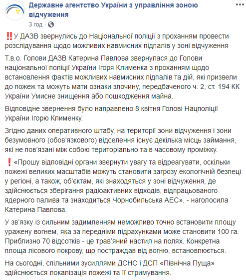 При этом 9 апреля, за пять дней до этого, и.о председателя ГАЗО Екатерина Павлова обратилась к начальнику Нацполиции и сообщила, что пожары больших масштабов могут представлять угрозу экологической безопасности в регионе, а также объектам, которые находятся в зоне отчуждения, где осуществляется хранение радиоактивных отходов.