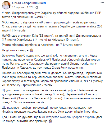 Всего в Украине, судя по этой справке, 250 тысяч лабораторных тестов. По данным Стефанишин, на 17 апреля было использовано более 16% поставленных тестов.