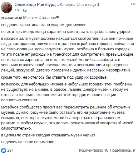 "Введение карантина стало ударом для музеев. Но их открытие до конца карантина может стать еще большим ударом", – написал Ройтбурд.