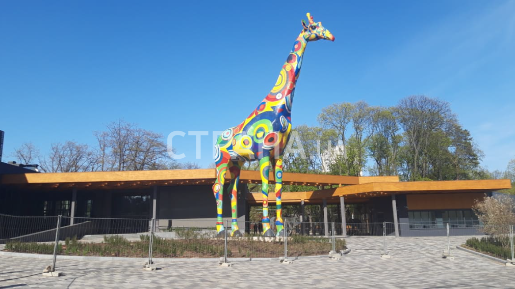 Также у нового входа уже установлена новая разноцветная скульптура жирафа.