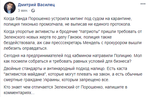 "Когда рагули во главе со Стерненко пришли под ОП, к ним вышла секретарша Мендель. Полиция никого не разгоняла и даже не составила протокол за нарушение карантина. Сегодня уже нищих предпринимателей под правительством разгоняли словно скот