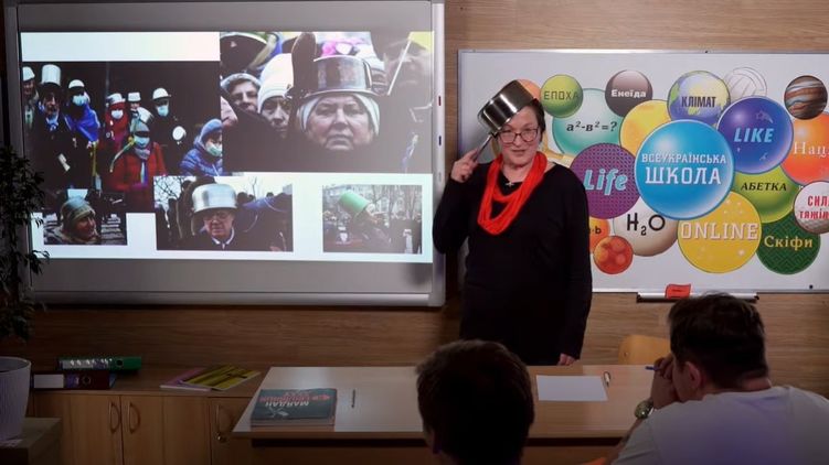 На уроке истории Украины для пятого класса в рамках "Всеукраинской школы онлайн", которая создана для дистанционного обучения школьников на карантине, учитель истории надела на голову кастрюлю. Она рассказывала детям про Майдан и войну на востоке.