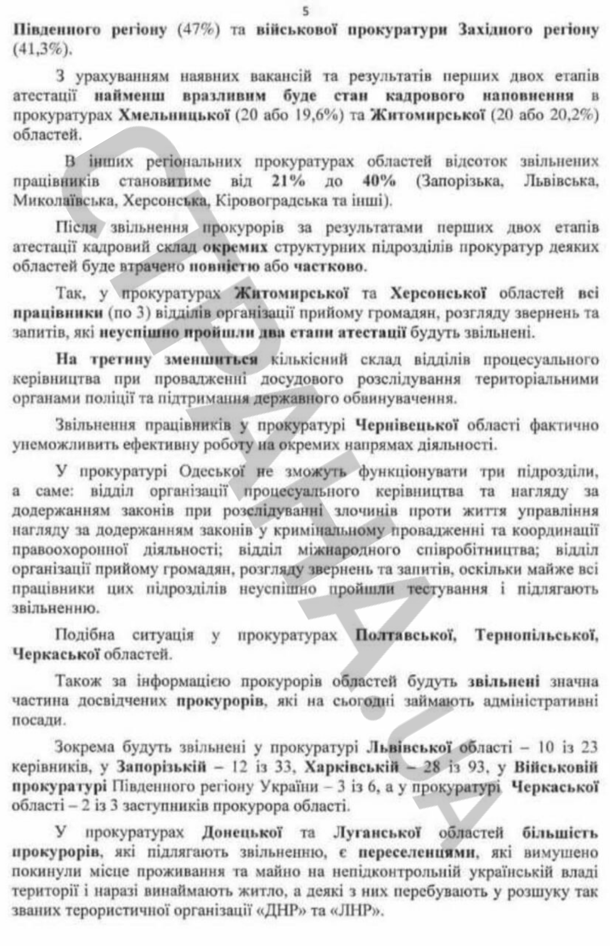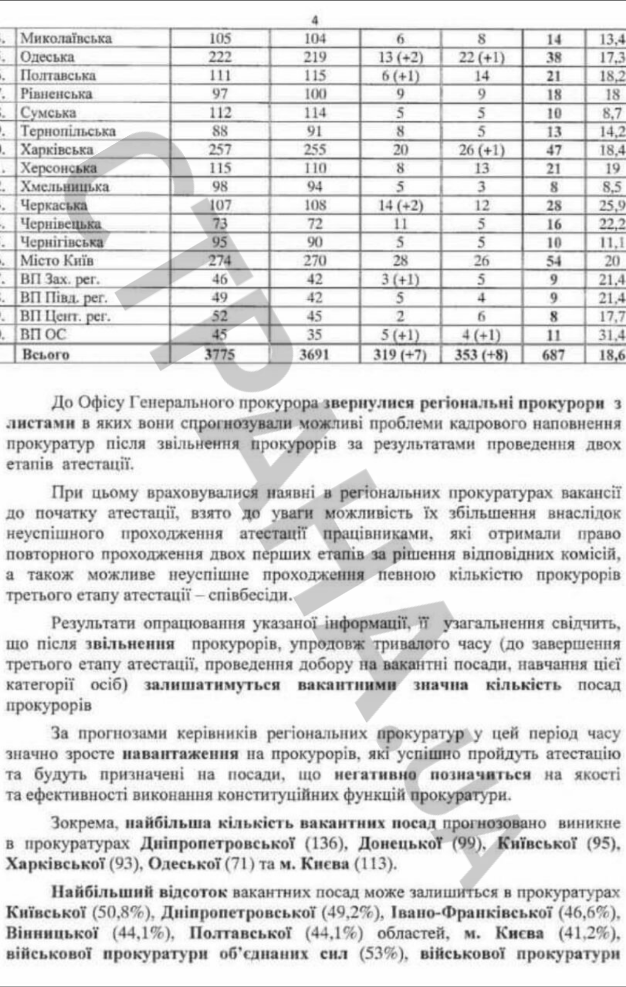 Согласно справке, если выполнить требование действующего закона и уволить всех прокуроров в областях, которые не прошли этапы аттестации времен Рябошапки, то почти во всех регионах страны кадровый состав сократится минимум на треть. Более того, в некоторых областях на отдельных важных направлениях вообще будет некому работать. Например, в Одесской области остался полностью обескровленным важный отдел по надзору за органами, которые расследуют преступления против жизни и здоровья.