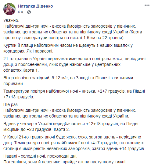 "В Киеве 21-го мая ночью будет ясно, сухо, завтра днем - периодически дождь. Температура воздуха ближайшей ночью + 4 + 7 градусов, в окрестностях столицы есть вероятность небольших заморозков, завтра днем +14 градусов" - пишет синоптик и добавляет, что небольшое потепление придет только на следующей неделе.