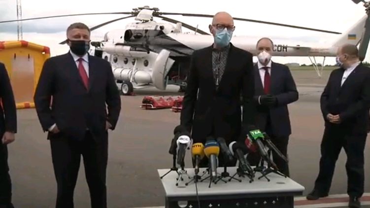 В своей краткой речи одетый в черную вышиванку, костюм и защитные перчатки Яценюк поблагодарил правительство за то, что оно обратило внимание на его родную Черновицкую область, которая больше остальных страдает из-за эпидемии коронавируса. Затем он сказал дежурные слова о том, что в эпидемию нужно поддерживать медиков.