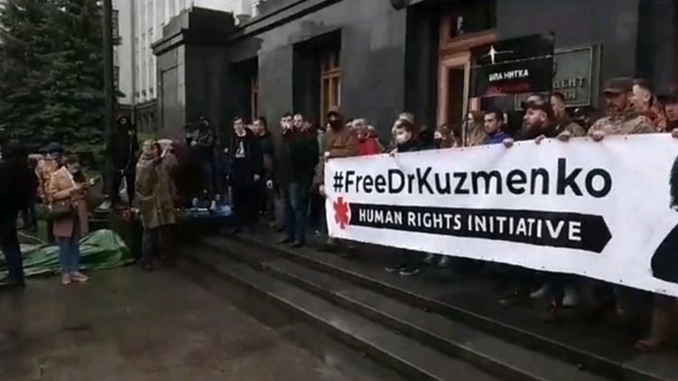 Собравшихся было немного: около сотни человек. На ступенях стояли лидер ультраправой организации С14 Евгений Карась и люди, которые держали растяжку с хэштегом на английском языке "Свободу доктору Кузьменко".