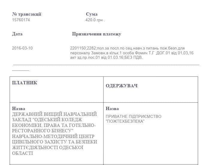 "Благодаря тому, что он передавал дела Соловей (замдиректора по АХЧ на время пожара - Ред.), на руках осталась его посадова, где указано, что он не являлся ответственным за пожарную безопасность, но указано, что он должен был организовать процесс обучения ответственных лиц. Ответственными за пожарную безопасность в колледже были Коваль О. П и здания на Троицкой - Фомич Т. Г., о чем свидетельствуют транзакции оплаты за их обучение. Последнее было в сентябре 2019 года. Кстати, на заседании судья под аудиозапись сказал: он в курсе, что ответственным за пожарную безопасность на Троицкой является Фомич Т. Г.", - пишет Елена Ротари. Также она опубликовала скрины транзакций об оплате обучения ответственных за пожарную безопасность сотрудников колледжа.