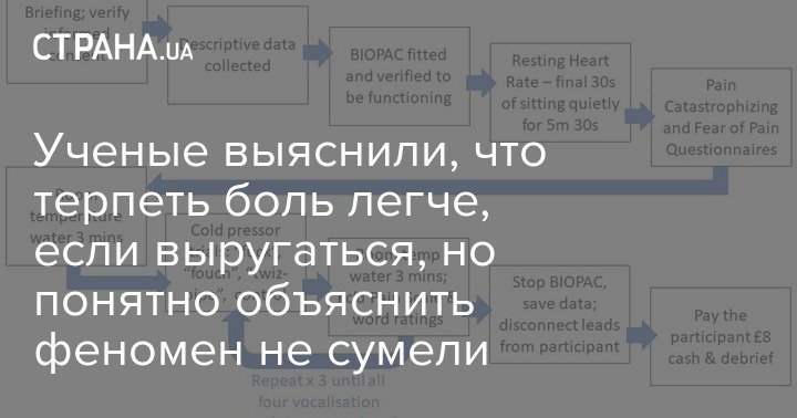 Поэтому исследователи Килского университета Ричард Стивенс и Олли Робертсон решили провести эксперимент с тремя словами: fouch, которое вызывает эмоциональную реакцию, ругательством fuck и выдуманным, но забавным словом twizpipe. Они попросили 92 добровольца опустить руку в контейнер с водой температуры от 3 до 5 градусов, оповестить о моменте, когда начиналась боль и продержать конечность максимально долго, пока боль не станет невыносимой. При этом испытуемым нужно было повторять одно из выбранных слов.