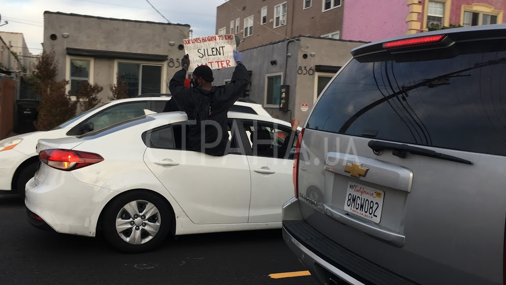 Многие американцы взобрались на автомобили. На одном мужчине футболка с изображением Иисуса Христа. За колонной протестующих наблюдают жители домов. Они снимают на камеры смартфонов все, то происходит.