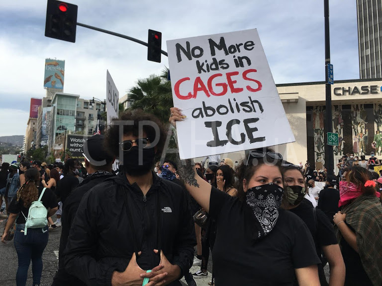 К толпе протестующих примкнули те, кто протестует против разделения семей мигрантов на американо-мексиканской границе. "Больше никаких детей в клетках".