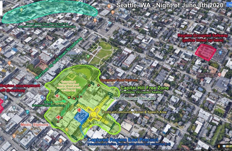 Отмечается, что шесть кварталов в центре Сиэтла были объявлены активистами "Зоной свободного Капитолийского холма" или "Автономной зоной Капитолийского холма".
