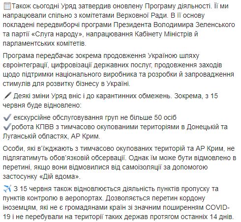 "Некоторые изменения правительство внесло и в карантинные ограничения. В частности, с 15 июня будет возобновлено: экскурсионное обслуживание групп не более 50 человек", - написал он.