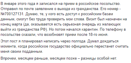 "Российский паспорт был нужен мне лишь для того, чтобы жить в оккупированном Крыму. Когда я оттуда уехал – нужда в нем отпала. Последние два года я буду собирать справки для выхода из российского гражданства", - сообщил Казарин, добавив, что в январе 2020 года - то есть почти через шесть лет - отправил в российское посольство заявление о выходе из гражданства РФ.