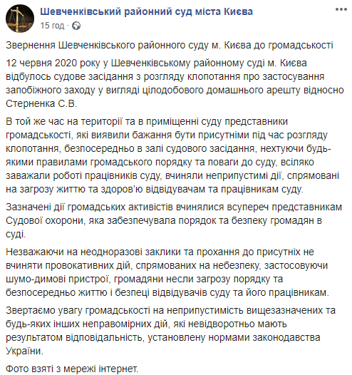 Шевченковский районный суд Киева заявил о том, что беспорядки, которые устроили сторонники Сергея Стерненко во время избрания ему меры пресечения по обвинению в умышленном убийстве, недопустимы.
