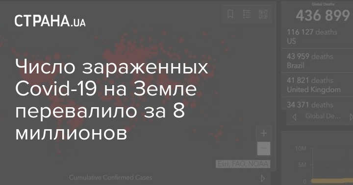 В 188 странах и регионах мира число зараженных коронавирусом достигло 8 003 021 человек, число скончавшихся - 436 899.
