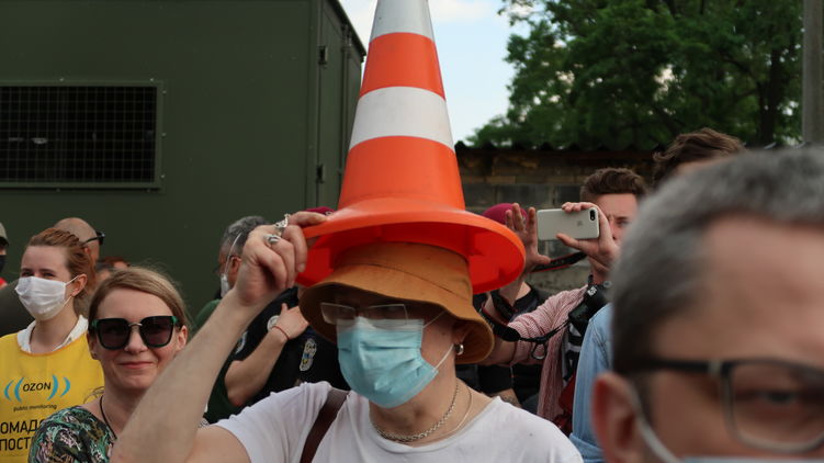 Республика Стерненко напоминает "чатовки" и "форумовки" из далекого прошлого. Здесь я встречу и Уляну Супрун, и ее мужа Марка, и Олега Сенцова и Янину Соколову. Но это все позже. Первым замечаю мужчину с футболкой "Стерненко" и респиратором, подписанным "Аваков черт". Это Алексей Цимбалюк, который проходит сейчас обвиняемым по делу о нападении на журналиста "Страны" и уже успел отметиться под судом провокацией с бросанием петард под ноги людей. На голове у Цимбалюка кепка с шевроном "Рысь".