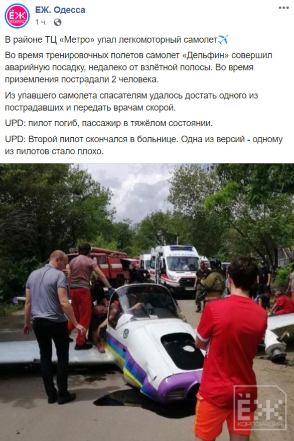"В Одессе неприятность, только что упал и разбился легкомоторный самолет. По предварительным данным, из двух человек, находившихся на борту один погиб.