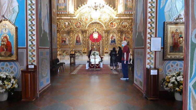 В храме стоит гроб с телом Алексея Порошенко. У гроба постоянно находятся две женщины, которые следят за порядком.