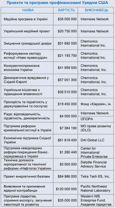 Интересен список программ, на которые американцы тратили деньги (о части из них уже рассказал выше Деркач). Всего на сумму более 600 миллионов долларов. Большинство этих названий обществу ни о чем не говорят. Но деньги огромные.