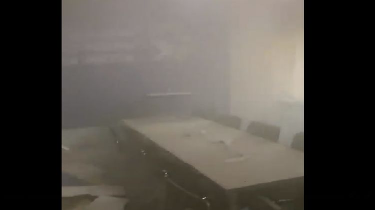 На видео, которое опубликовал Кива, запечатлен офис уже после взрыва - в помещении достаточно много дыма, частично осыпался потолок.