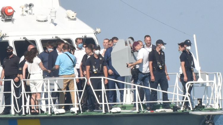 На катере, полном силовиков, заметили также губернатора Одесской области Максима Куцого и мэра Геннадия Труханова. Накануне Зеленский потребовал убрать танкер до 20 июля - до этого местные власти обещали, что разберутся с проблемой до 28 июня.