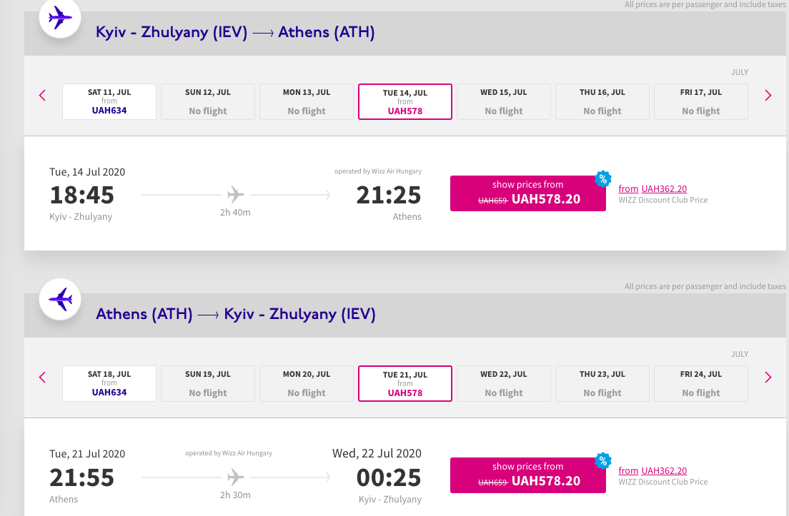 На сайте доступны билеты из Киева в Афины, курсирующие дважды в неделю