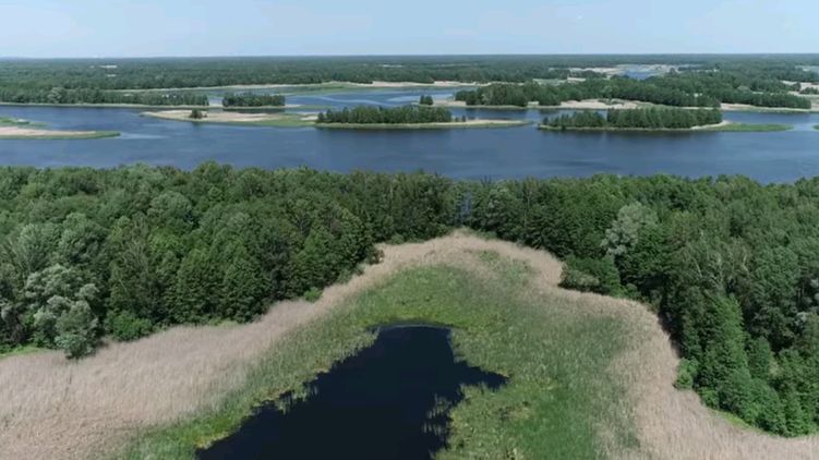 В коротком ролике берега Припяти показаны в разгар лета. На видео попали русло реки с островками, лесистые берега и синее небо.